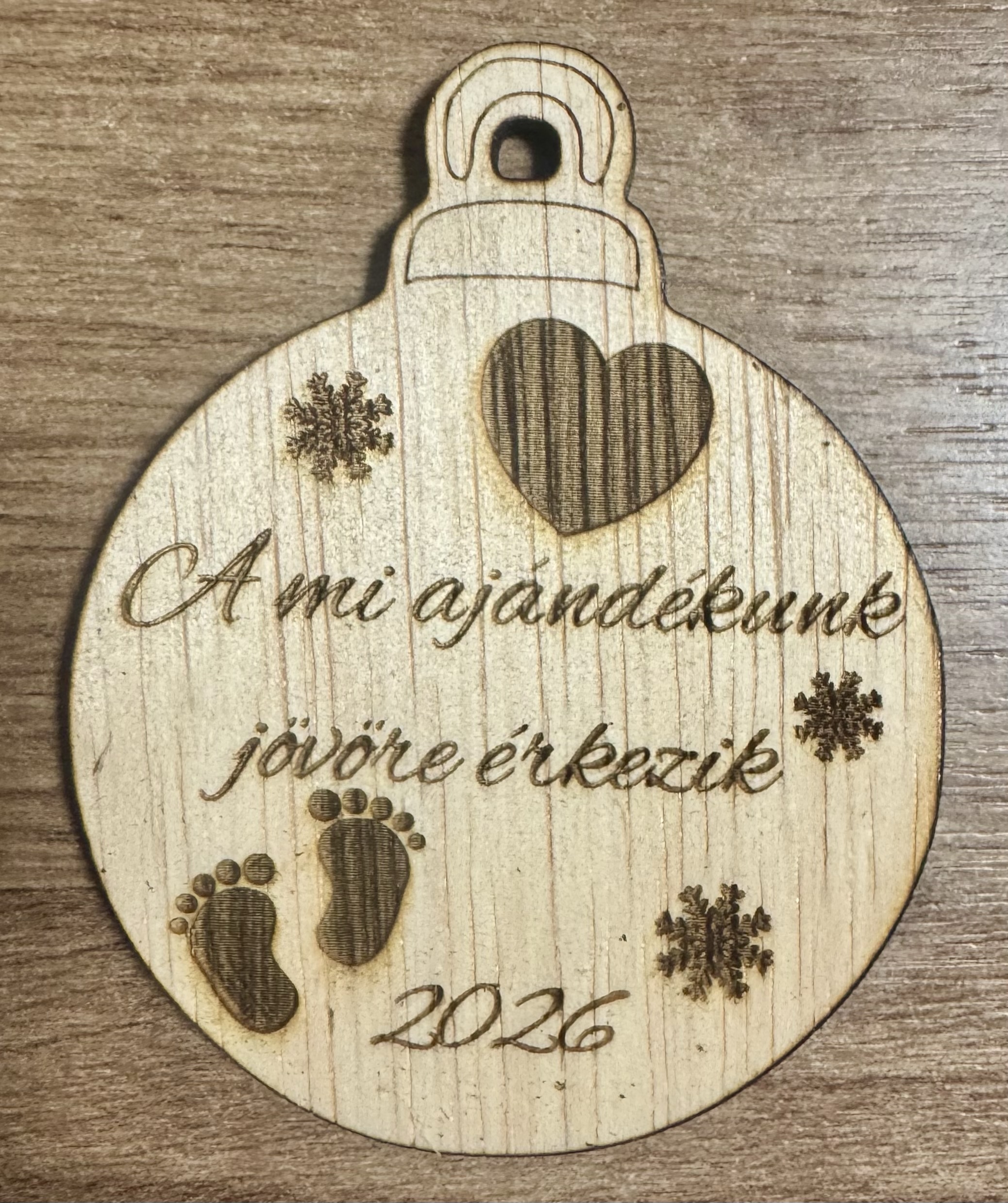 Ez a gyönyörű, lézergravírozott fa karácsonyi dísz meghitt és egyedi módja annak, hogy bejelentsétek a család legújabb tagjának érkezését. A „A mi ajándékunk jövőre érkezik – 2026” felirat, a kis láblenyomatok és a szív motívum finom, személyes hangulatot kölcsönöz a dísznek. Ideális ajándék családtagoknak, barátoknak vagy akár a karácsonyfa különleges ékeként. Kézzel készült hatást keltő, természetes fa alapanyagból