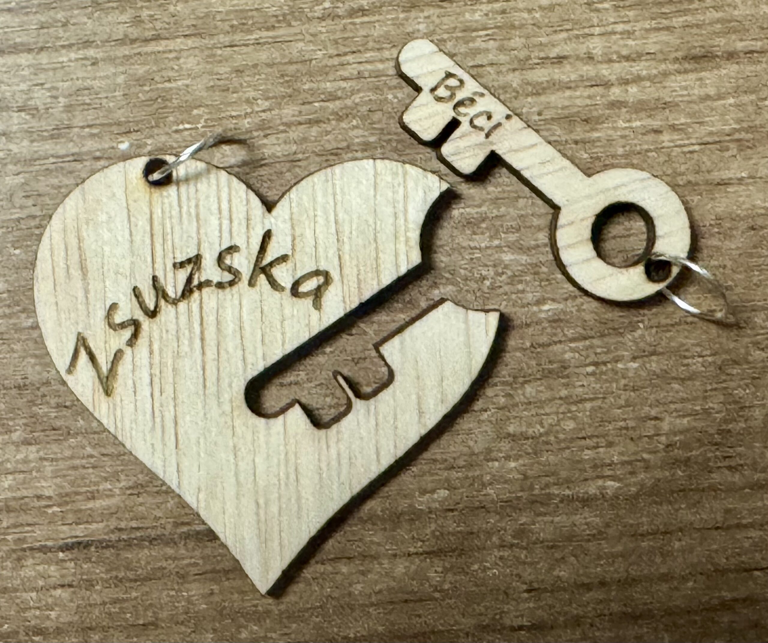 Szív és kulcs formájú, gravírozott páros kulcstartó fából. Romantikus, személyes ajándék pároknak.